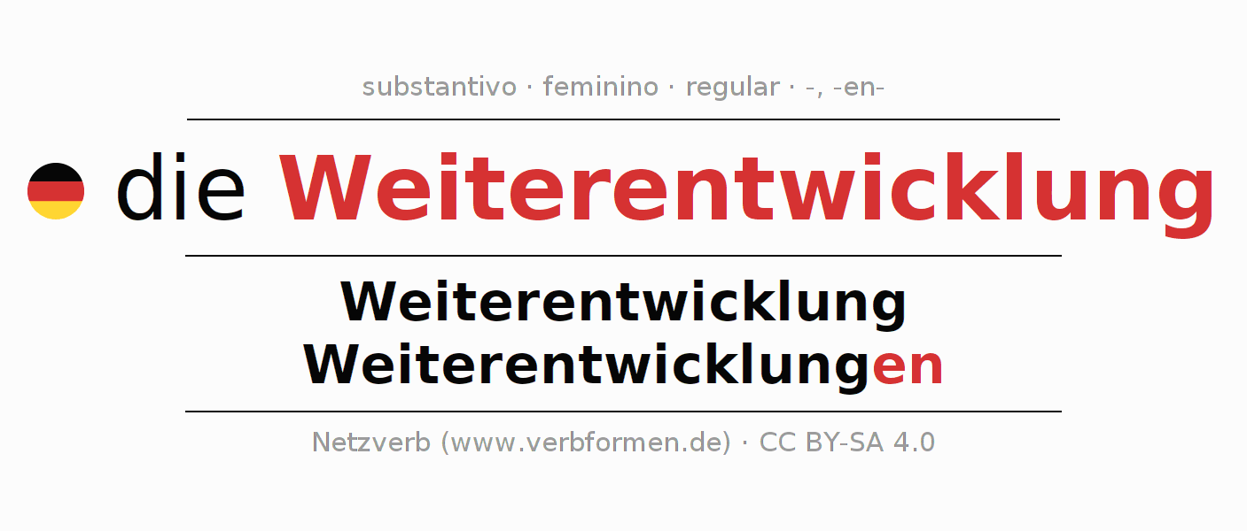 Declinação de Weiterentwicklung é apresentada em uma tabela com todas as formas no singular e no plural (plural) e em todos os quatro casos: nominativo (1º caso), genitivo (2º caso), dativo (3º caso) e acusativo (4º caso) . Especialmente para os alunos de alemão, a correta declinação da palavra Weiterentwicklung é fundamental.