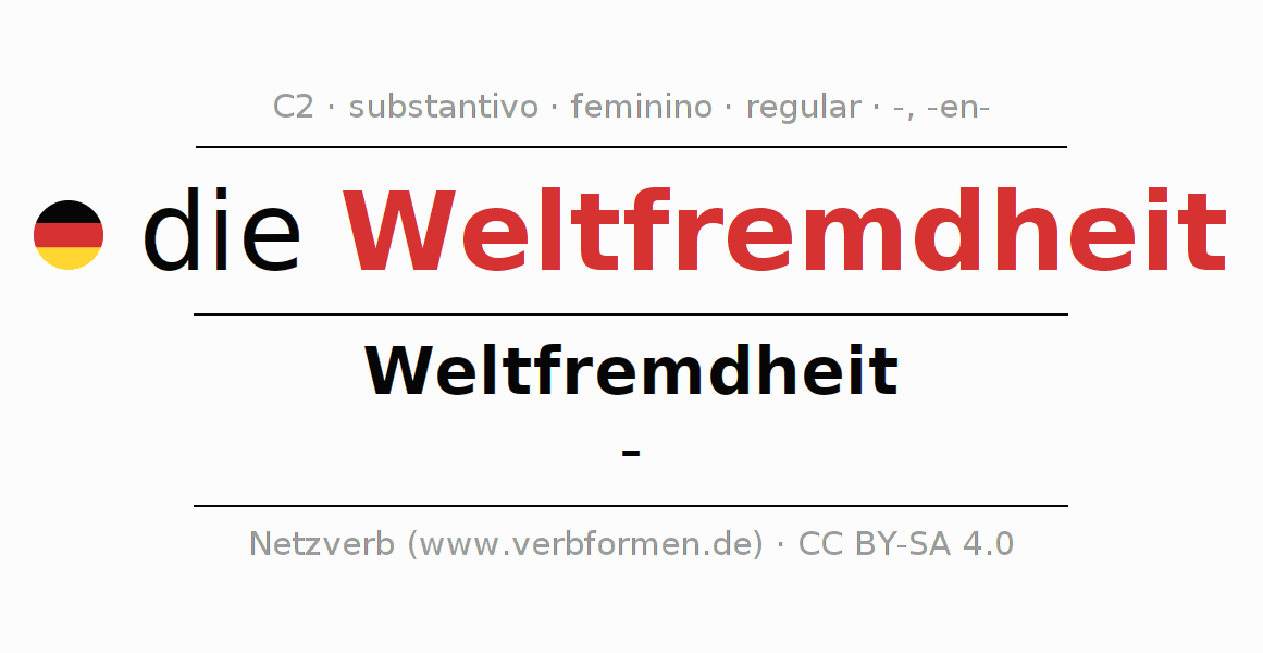 A declinação do substantivo Weltfremdheit (alienação, desconexão) está no genitivo singular Weltfremdheit e no nominativo plural - . O substantivo fraco Weltfremdheit é declinado com a terminação -/-. Não há formas no plural. O gênero gramatical de Weltfremdheit é feminino e o artigo definido é "die". Não se pode somente declinar o substantivo Weltfremdheit mas sim todos os substantivos em alemão. O substantivo faz parte do vocabulário referente ao Certificado em Alemão do Nível C2. Comentários ☆