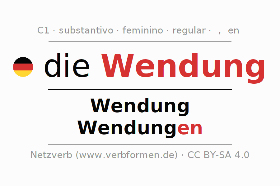 Declinação de Wendung é apresentada em uma tabela com todas as formas no singular e no plural (plural) e em todos os quatro casos: nominativo (1º caso), genitivo (2º caso), dativo (3º caso) e acusativo (4º caso) . Especialmente para os alunos de alemão, a correta declinação da palavra Wendung é fundamental.