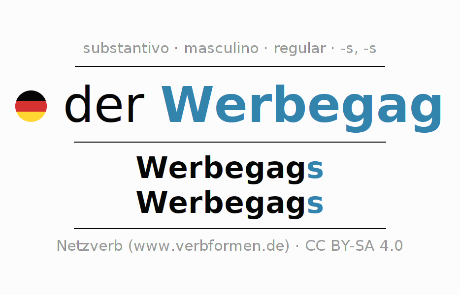 Declinação de Werbegag é apresentada em uma tabela com todas as formas no singular e no plural (plural) e em todos os quatro casos: nominativo (1º caso), genitivo (2º caso), dativo (3º caso) e acusativo (4º caso) . Especialmente para os alunos de alemão, a correta declinação da palavra Werbegag é fundamental.