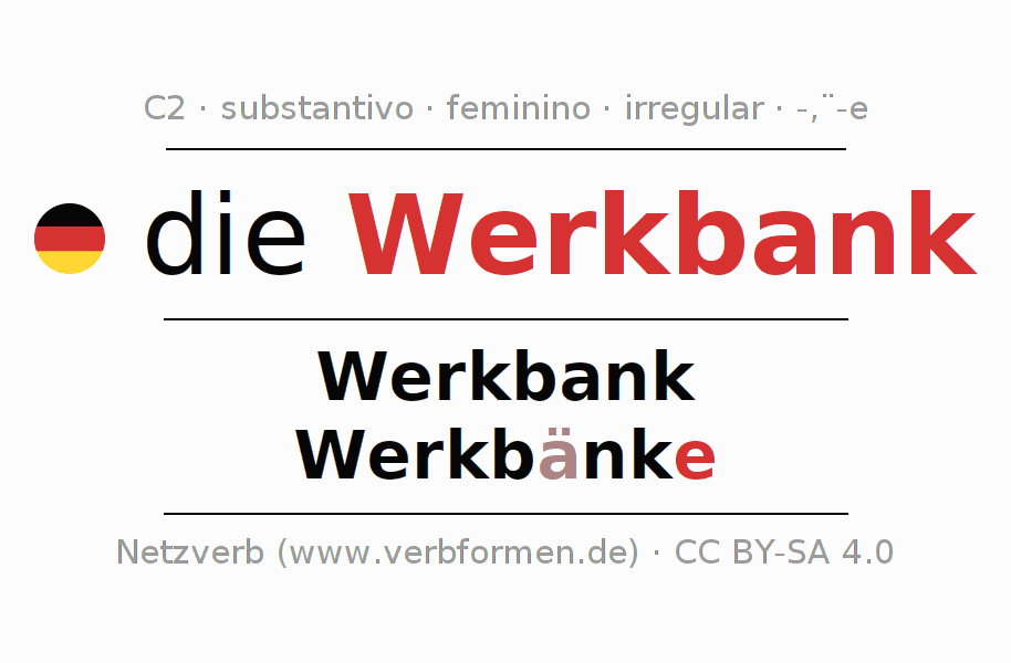 A declinação do substantivo Werkbank (bancada, bancada de trabalho) está no genitivo singular Werkbank e no nominativo plural Werkbänke . O substantivo forte Werkbank é declinado com a terminação -/ä-e. No plural com um trema. O gênero gramatical de Werkbank é feminino e o artigo definido é "die". Não se pode somente declinar o substantivo Werkbank mas sim todos os substantivos em alemão. O substantivo faz parte do vocabulário referente ao Certificado em Alemão do Nível C2. Comentários ☆