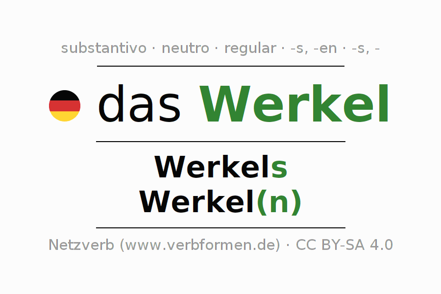 Declinação de Werkel é apresentada em uma tabela com todas as formas no singular e no plural (plural) e em todos os quatro casos: nominativo (1º caso), genitivo (2º caso), dativo (3º caso) e acusativo (4º caso) . Especialmente para os alunos de alemão, a correta declinação da palavra Werkel é fundamental.