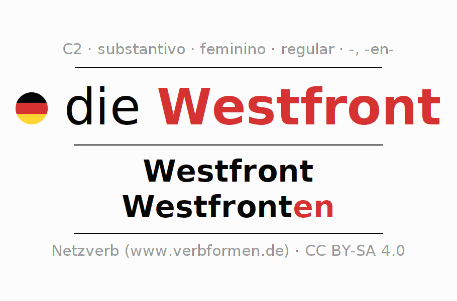 Declinação de Westfront é apresentada em uma tabela com todas as formas no singular e no plural (plural) e em todos os quatro casos: nominativo (1º caso), genitivo (2º caso), dativo (3º caso) e acusativo (4º caso) . Especialmente para os alunos de alemão, a correta declinação da palavra Westfront é fundamental.