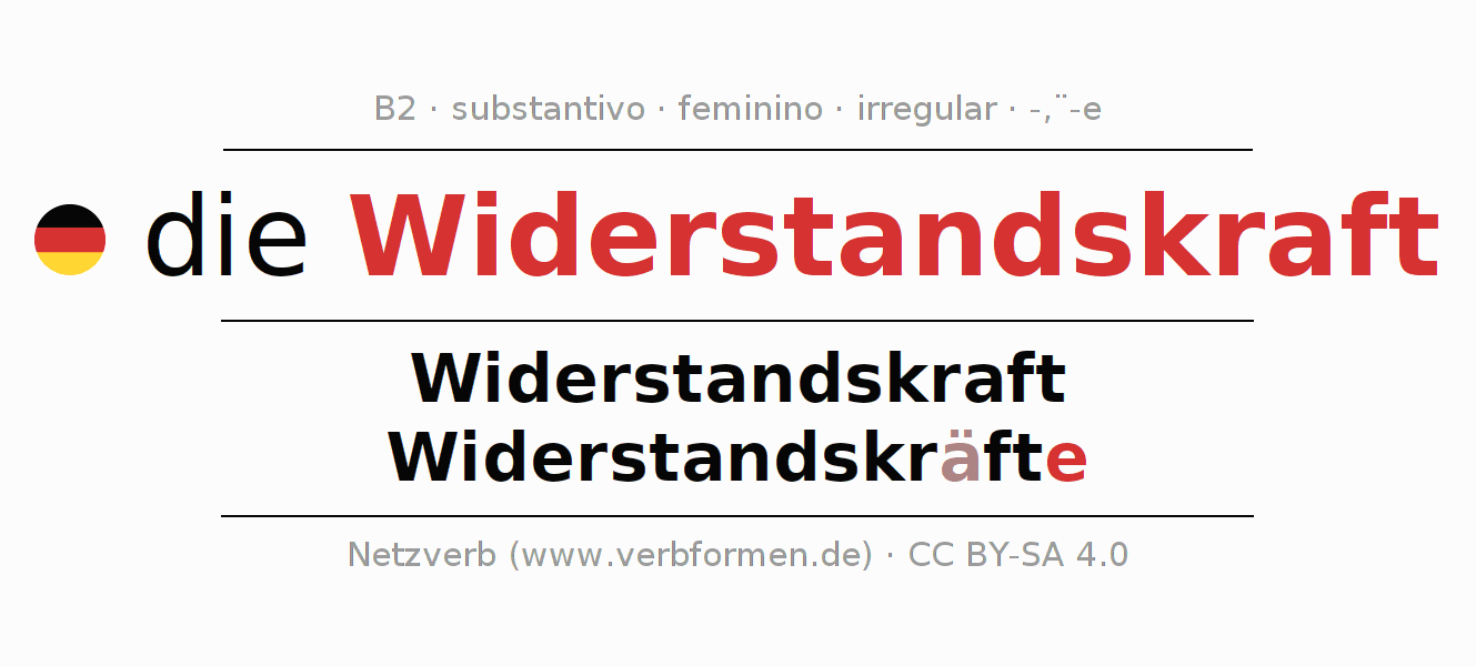 A declinação do substantivo Widerstandskraft (bojo, força de resistência) está no genitivo singular Widerstandskraft e no nominativo plural Widerstandskräfte . O substantivo forte Widerstandskraft é declinado com a terminação -/ä-e. No plural com um trema. O gênero gramatical de Widerstandskraft é feminino e o artigo definido é "die". Não se pode somente declinar o substantivo Widerstandskraft mas sim todos os substantivos em alemão. O substantivo faz parte do vocabulário referente ao Certificado em Alemão do Nível B2. Comentários ☆