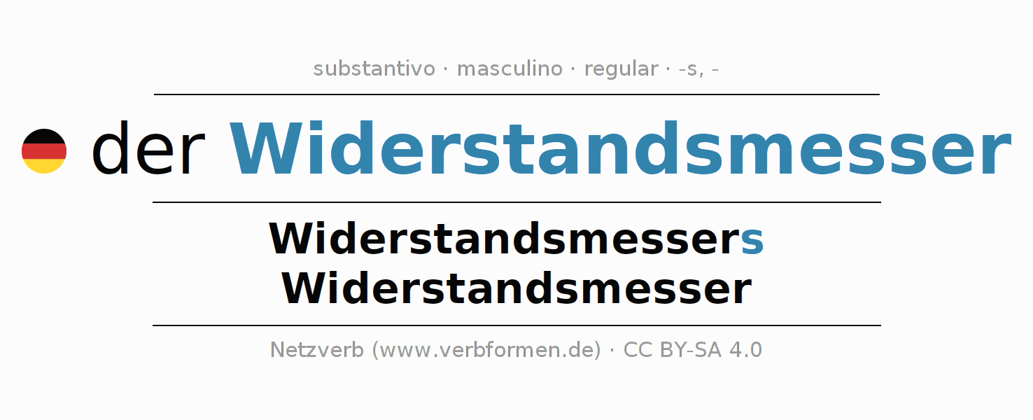 A declinação do substantivo Widerstandsmesser (ohmímetro) está no genitivo singular Widerstandsmessers e no nominativo plural Widerstandsmesser . O substantivo forte Widerstandsmesser é declinado com a terminação s/-. O gênero gramatical de Widerstandsmesser é masculino e o artigo definido é 'der'. Não se pode somente declinar o substantivo Widerstandsmesser mas sim todos os substantivos em alemão. Comentários ☆