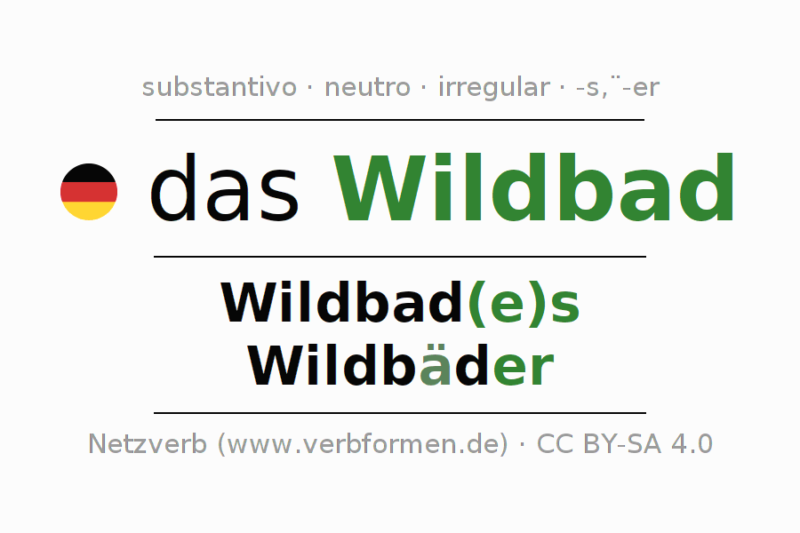 A declinação do substantivo Wildbad está no genitivo singular Wildbad(e)s e no nominativo plural Wildbäder . O substantivo forte Wildbad é declinado com a terminação es/ä-er. No plural com um trema. O gênero gramatical de Wildbad é neutro e o artigo definido é "das". Não se pode somente declinar o substantivo Wildbad mas sim todos os substantivos em alemão. Comentários ☆