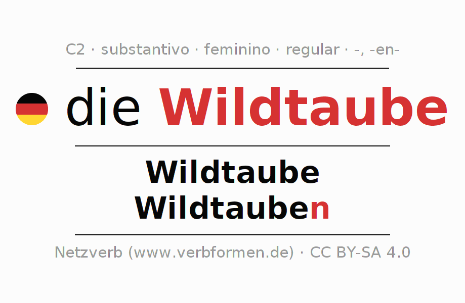 Declinação de Wildtaube é apresentada em uma tabela com todas as formas no singular e no plural (plural) e em todos os quatro casos: nominativo (1º caso), genitivo (2º caso), dativo (3º caso) e acusativo (4º caso) . Especialmente para os alunos de alemão, a correta declinação da palavra Wildtaube é fundamental.