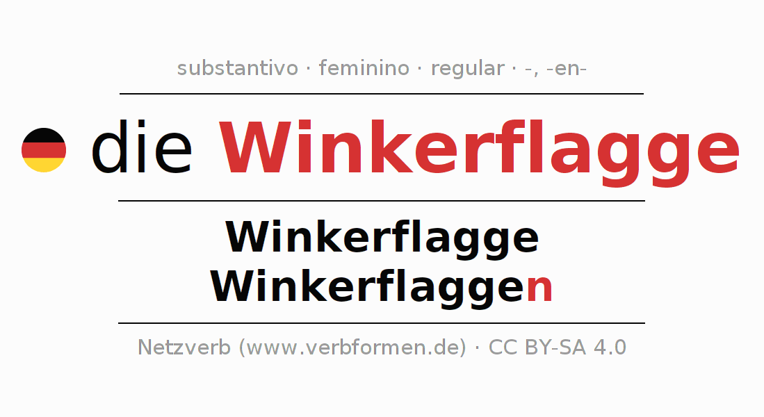 Declinação de Winkerflagge é apresentada em uma tabela com todas as formas no singular e no plural (plural) e em todos os quatro casos: nominativo (1º caso), genitivo (2º caso), dativo (3º caso) e acusativo (4º caso) . Especialmente para os alunos de alemão, a correta declinação da palavra Winkerflagge é fundamental.