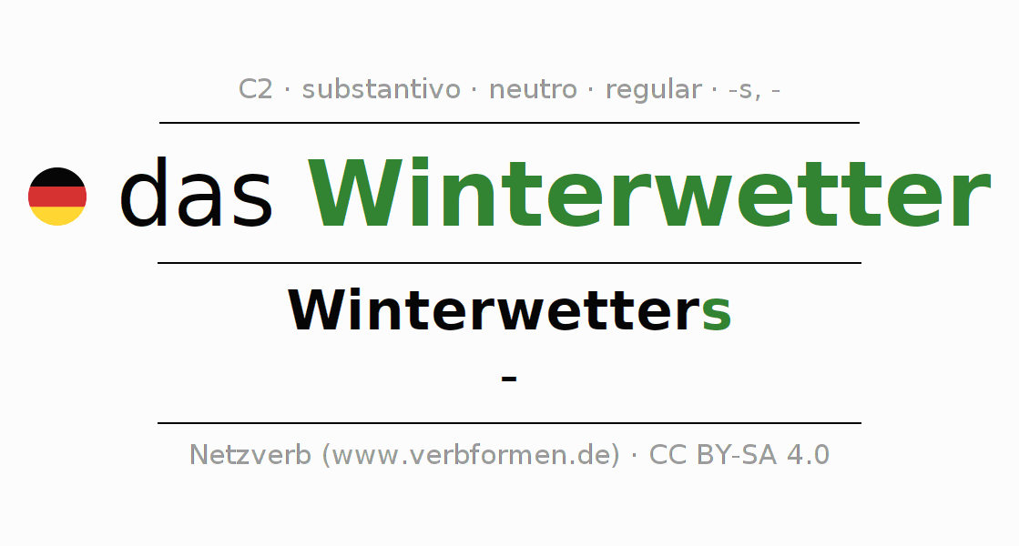 A declinação do substantivo Winterwetter (clima invernal, tempo de inverno) está no genitivo singular Winterwetters e no nominativo plural - . O substantivo forte Winterwetter é declinado com a terminação s/-. Não há formas no plural. O gênero gramatical de Winterwetter é neutro e o artigo definido é "das". Não se pode somente declinar o substantivo Winterwetter mas sim todos os substantivos em alemão. O substantivo faz parte do vocabulário referente ao Certificado em Alemão do Nível C2. Comentários ☆