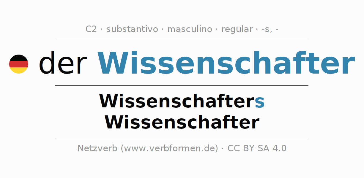 Declinação de Wissenschafter é apresentada em uma tabela com todas as formas no singular e no plural (plural) e em todos os quatro casos: nominativo (1º caso), genitivo (2º caso), dativo (3º caso) e acusativo (4º caso) . Especialmente para os alunos de alemão, a correta declinação da palavra Wissenschafter é fundamental.