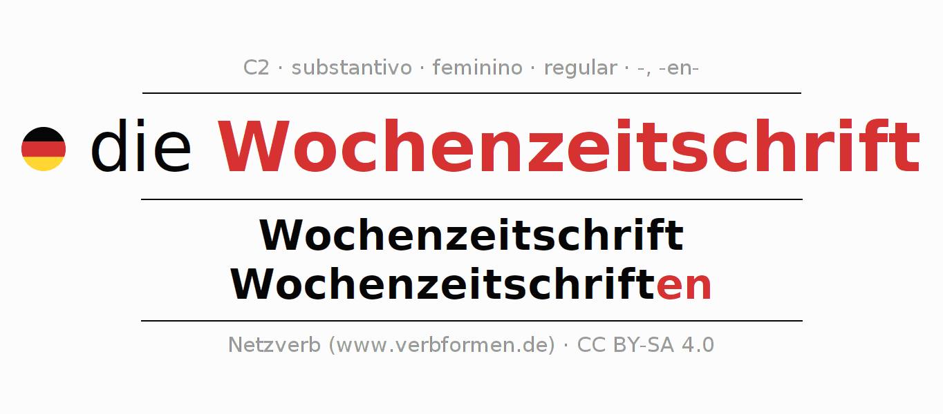 Declinação de Wochenzeitschrift é apresentada em uma tabela com todas as formas no singular e no plural (plural) e em todos os quatro casos: nominativo (1º caso), genitivo (2º caso), dativo (3º caso) e acusativo (4º caso) . Especialmente para os alunos de alemão, a correta declinação da palavra Wochenzeitschrift é fundamental.