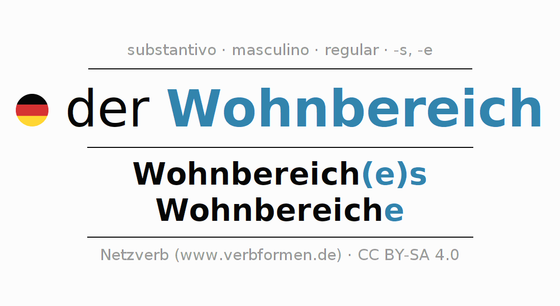 A declinação do substantivo Wohnbereich (zona residencial, área habitável) está no genitivo singular Wohnbereich(e)s e no nominativo plural Wohnbereiche . O substantivo forte Wohnbereich é declinado com a terminação es/e. O gênero gramatical de Wohnbereich é masculino e o artigo definido é 'der'. Não se pode somente declinar o substantivo Wohnbereich mas sim todos os substantivos em alemão. Comentários ☆