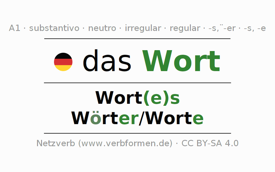 Declinação de Wort é apresentada em uma tabela com todas as formas no singular e no plural (plural) e em todos os quatro casos: nominativo (1º caso), genitivo (2º caso), dativo (3º caso) e acusativo (4º caso) . Especialmente para os alunos de alemão, a correta declinação da palavra Wort é fundamental.