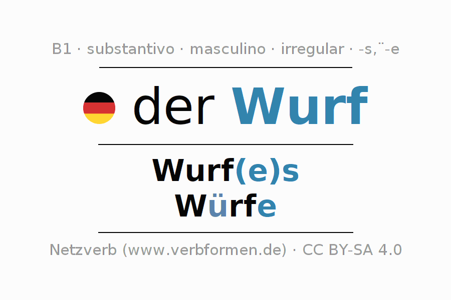 Declinação de Wurf é apresentada em uma tabela com todas as formas no singular e no plural (plural) e em todos os quatro casos: nominativo (1º caso), genitivo (2º caso), dativo (3º caso) e acusativo (4º caso) . Especialmente para os alunos de alemão, a correta declinação da palavra Wurf é fundamental.