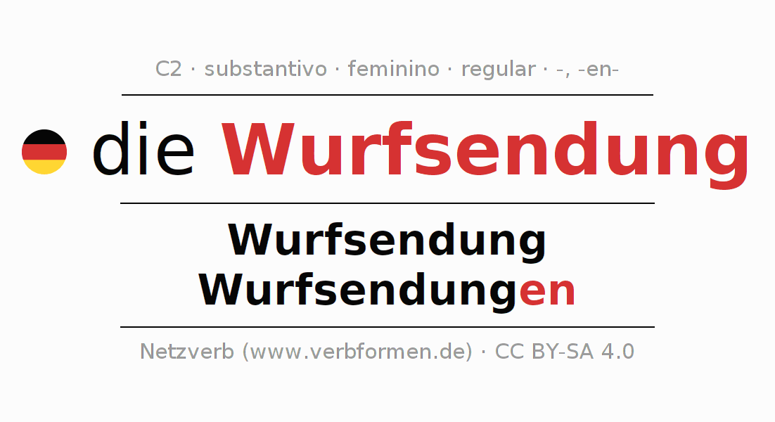 Declinação de Wurfsendung é apresentada em uma tabela com todas as formas no singular e no plural (plural) e em todos os quatro casos: nominativo (1º caso), genitivo (2º caso), dativo (3º caso) e acusativo (4º caso) . Especialmente para os alunos de alemão, a correta declinação da palavra Wurfsendung é fundamental.