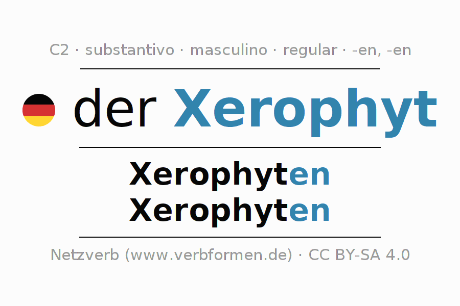 - Singular: der Xerophyt, des Xerophyten, dem Xerophyten, den Xerophyten