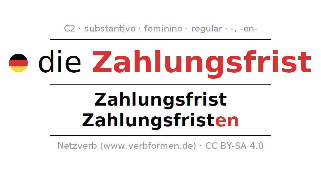 A declinação do substantivo Zahlungsfrist (prazo de pagamento) está no genitivo singular Zahlungsfrist e no nominativo plural Zahlungsfristen . O substantivo fraco Zahlungsfrist é declinado com a terminação -/en. O gênero gramatical de Zahlungsfrist é feminino e o artigo definido é "die". Não se pode somente declinar o substantivo Zahlungsfrist mas sim todos os substantivos em alemão. O substantivo faz parte do vocabulário referente ao Certificado em Alemão do Nível C2. Comentários ☆