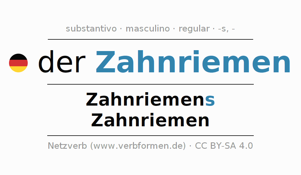 - Singular: der Zahnriemen, des Zahnriemens, dem Zahnriemen, den Zahnriemen