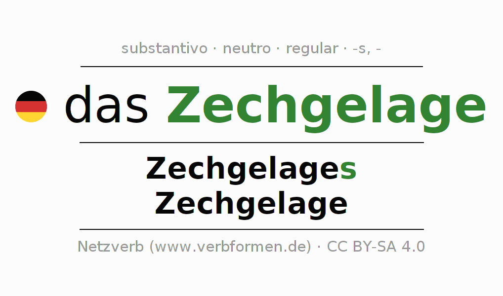 A declinação do substantivo Zechgelage (bebedeira, festa de bebida) está no genitivo singular Zechgelages e no nominativo plural Zechgelage . O substantivo forte Zechgelage é declinado com a terminação s/-. O gênero gramatical de Zechgelage é neutro e o artigo definido é "das". Não se pode somente declinar o substantivo Zechgelage mas sim todos os substantivos em alemão. Comentários ☆