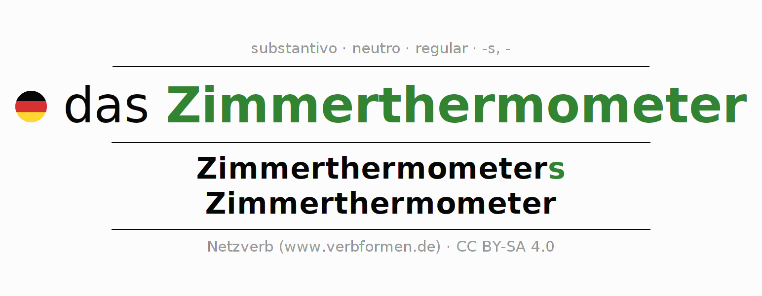 A declinação do substantivo Zimmerthermometer (termômetro ambiente, termômetro de ambiente) está no genitivo singular Zimmerthermometers e no nominativo plural Zimmerthermometer . O substantivo forte Zimmerthermometer é declinado com a terminação s/-. O gênero gramatical de Zimmerthermometer é neutro e o artigo definido é "das". O substantivo também pode ser usado com outros géneros e outros artigos. Não se pode somente declinar o substantivo Zimmerthermometer mas sim todos os substantivos em alemão. Comentários ☆