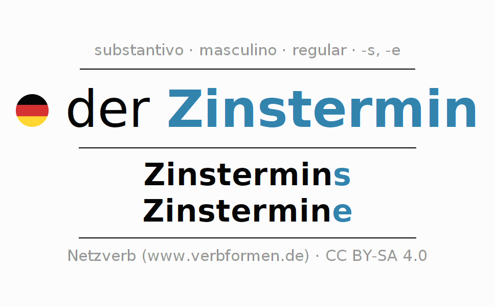A declinação do substantivo Zinstermin (data de pagamento de juros) está no genitivo singular Zinstermins e no nominativo plural Zinstermine . O substantivo forte Zinstermin é declinado com a terminação s/e. O gênero gramatical de Zinstermin é masculino e o artigo definido é 'der'. Não se pode somente declinar o substantivo Zinstermin mas sim todos os substantivos em alemão. Comentários ☆