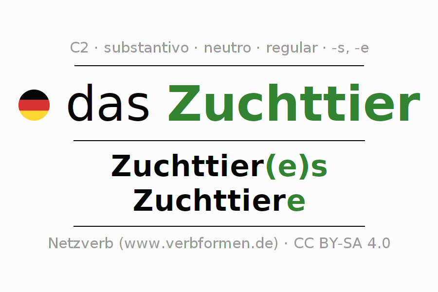 Declinação de Zuchttier é apresentada em uma tabela com todas as formas no singular e no plural (plural) e em todos os quatro casos: nominativo (1º caso), genitivo (2º caso), dativo (3º caso) e acusativo (4º caso) . Especialmente para os alunos de alemão, a correta declinação da palavra Zuchttier é fundamental.