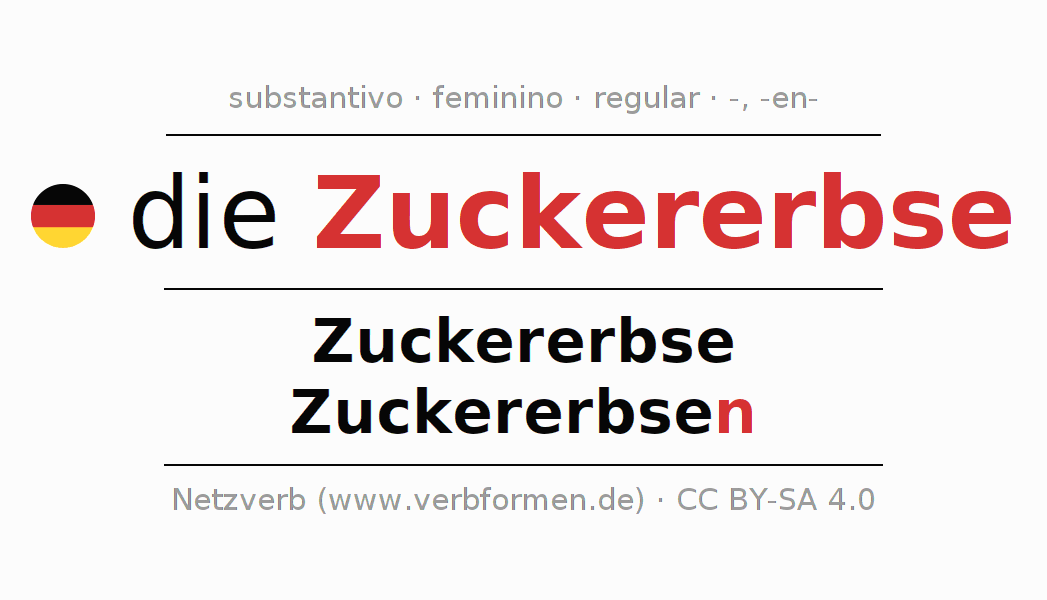 A declinação do substantivo Zuckererbse (ervilha-doce, ervilha-torta) está no genitivo singular Zuckererbse e no nominativo plural Zuckererbsen . O substantivo fraco Zuckererbse é declinado com a terminação -/n. O gênero gramatical de Zuckererbse é feminino e o artigo definido é "die". Não se pode somente declinar o substantivo Zuckererbse mas sim todos os substantivos em alemão. Comentários ☆