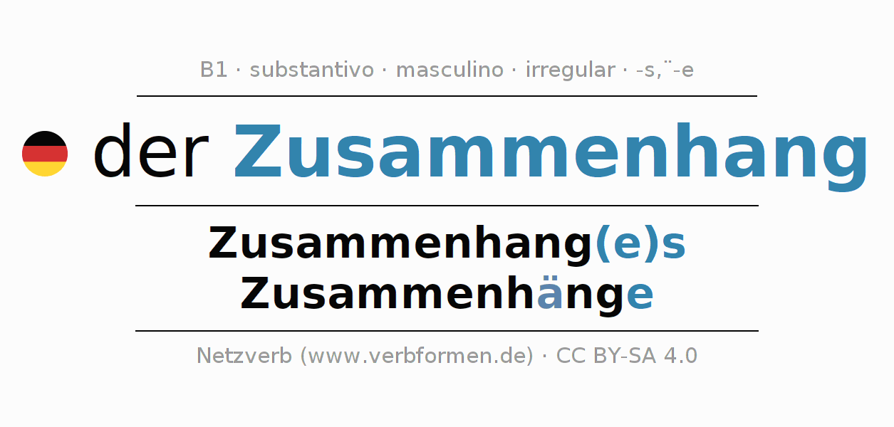 Declinação de Zusammenhang é apresentada em uma tabela com todas as formas no singular e no plural (plural) e em todos os quatro casos: nominativo (1º caso), genitivo (2º caso), dativo (3º caso) e acusativo (4º caso) . Especialmente para os alunos de alemão, a correta declinação da palavra Zusammenhang é fundamental.
